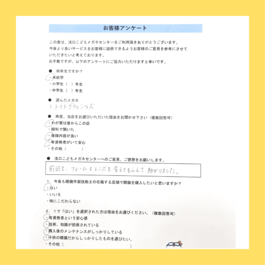 「前回も、フレームもレンズも変えてもらえて助かりました。」とご感想頂きました